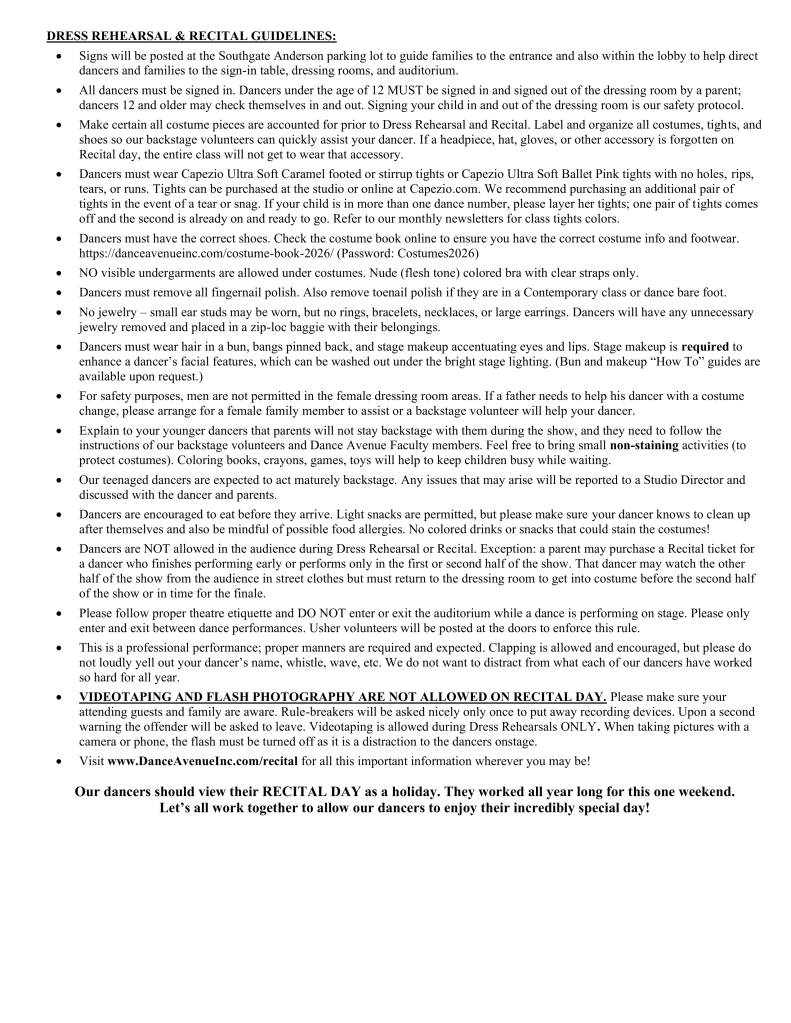 We wholeheartedly encourage all our dancers to stay for the entire Recital show. We would love for all of our dancers to take part in the End Finale, which allows students to celebrate as a family and take their final bows together!