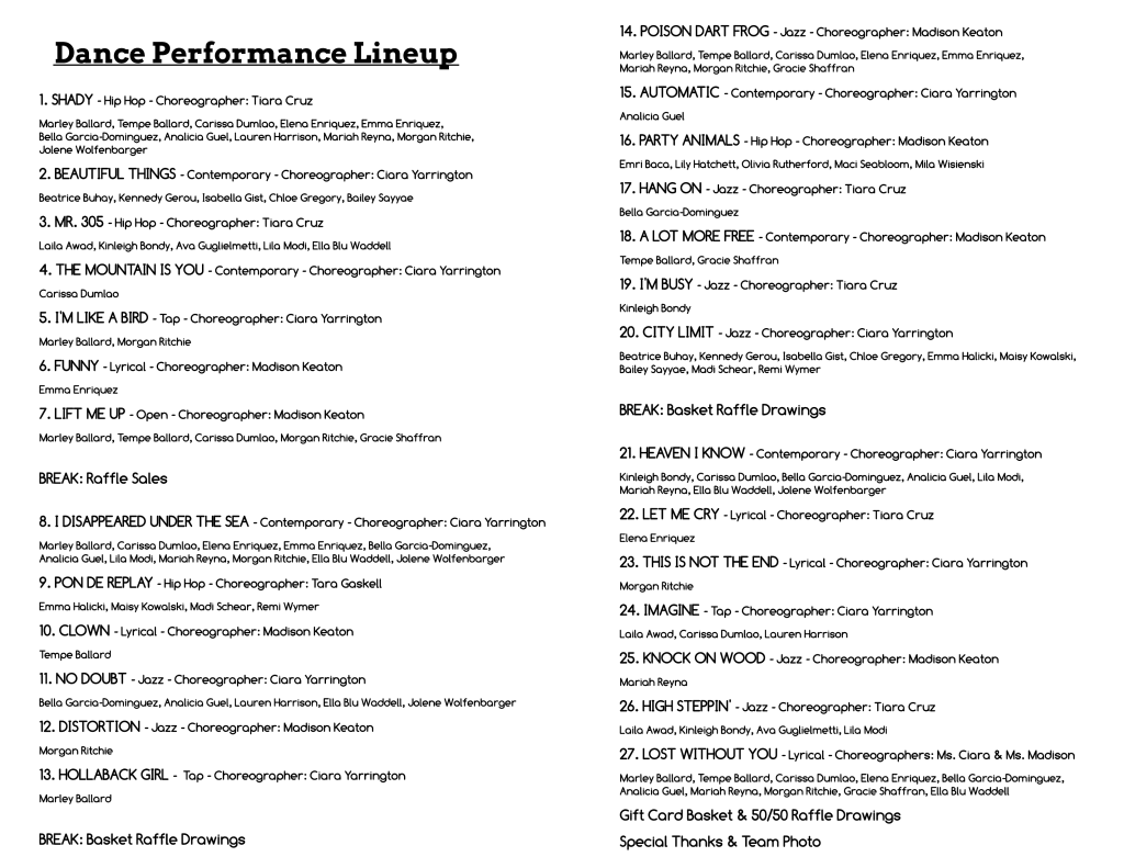 Please help support their season by purchasing refreshments and raffle tickets. All of tonight’s proceeds go directly to our very deserving dancers.